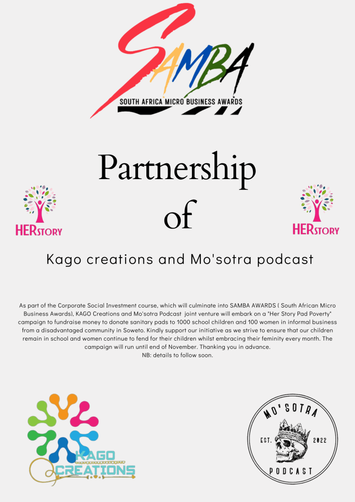 Let us join as many hands as possible together to make SAMBA ( South African Micro Business Awards) a success. KAGO Creations and Mo’sotra Podcast have definitely taken the bull by its horns and together with various esteemed business partners they have identified and are in talks with, will ensure that the “HERstory Pad Poverty ” campaign becomes a success from their end. Come one come all!